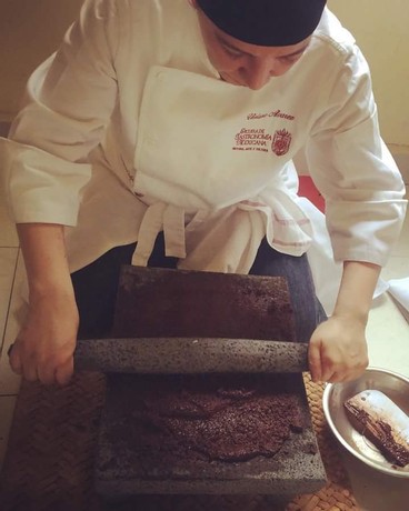 Cette fois-ci, j’ai reçu des fèves de cacao lesquels j’ai fait toaster pour les broyer à la main avec l’aide d’outil pré-hispanique nommé metate, du feu, et de la friction exercé avec la main du metate ou metlapil. Des heures de travail ainsi qu’une quantité d’énergie incalculable jusqu’à l’épuisement physique rassemblé à la magie du savoir ancestrale qui m’a été partagé par mes professeurs en cuisine pour m’aider à convertir ces fèves de cacao en chocolat.
