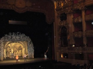 Jalamos la puerta del palco aspirando ver algo y estaba abierla, aunque la sala oscura. Por un momento pensé que sólo podríamos ver algo gracias al flash y a la fotografía. De un momento a otro, comenzó un ensayo de iluminación y entrada y salida de escenografías: 6 piernas, 2 directores de escena, y un candelabro que poco a poco se encendió para iluminar y ser capaces de apreciar el recinto y quedar sin palabras; sólo interjecciones.