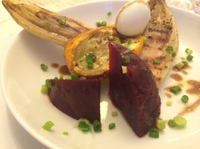 The entrées started parading the dining room with the fourth course of the evening, together with the beers and the pickled preparations which accompanied them proudly. I personally am not a fan of pickles, but I have to say these were all very well achieved and were not aggressive to my taste buds at all. Firstly, we enjoyed a waffled-sandwich with maple syrup and spicy chicken, oven-dried pear chips, and pickled red cabbage. Now we start to struggle, for I want to eat more, but I have to save a bit of space for whatever there is still being plated in the kitchen. So, I decide to be more discrete in my intake, though I was really enjoying my dinner.  As the fifth plate enters the room, the guests start expressing ourselves almost purely in interjections. It was a mixture of surprises while researching within our systems.